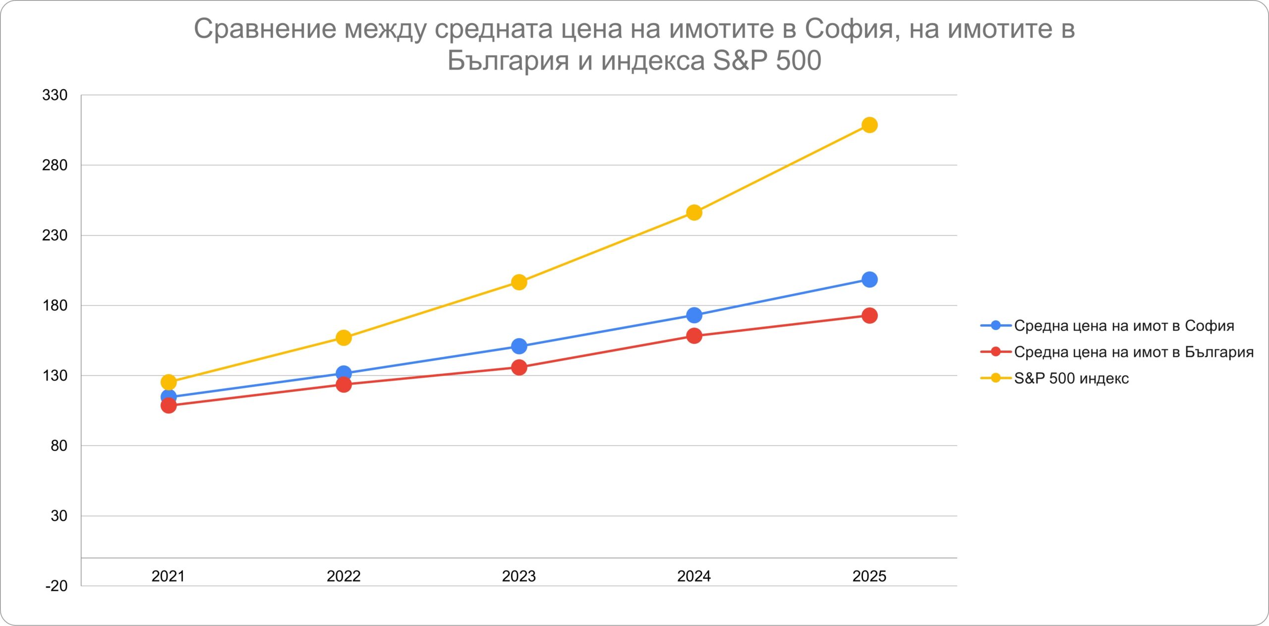 За същия период глобалните фондови пазари превъзхождат доходността на българските имоти с голяма разлика. MSCI World Index (total return) нараства с около 170%, а S&P 500 (total return) – с приблизително 208%.