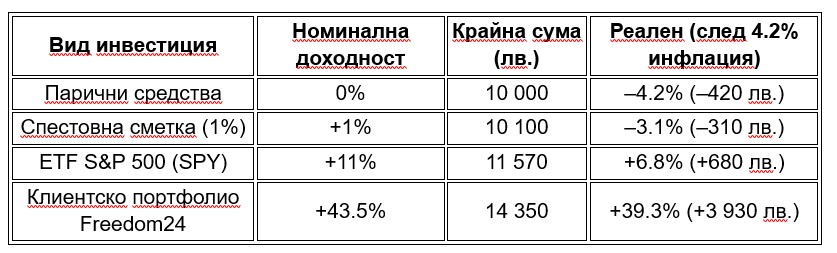 Според анализа на Freedom24, инфлацията в България достига 4.2% през първите осем месеца на 2025 г. За същия период глобални пазарни индекси като iShares MSCI World ETF и S&P 500 ETF носят доходност между 10% и 11%, което означава 6–7% реален прираст след корекция за инфлация.