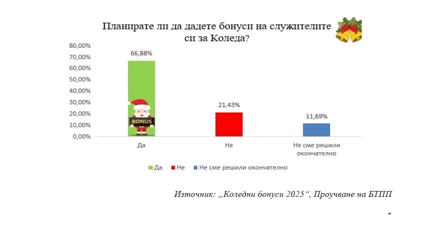 Традиционното предколедно проучване, проведено от Българската търговско-промишлена палата в периода 09-13 декември 2025 г., не показва съществена промяна в практиките на българските фирми по отношение на допълнителните възнаграждения (бонуси) около Коледа, въпреки че делът на фирмите, които ще дадат бонуси, е по-малък в сравнение с 2024г, а именно 67% , сравнено със 74% от проучването за 2024г.