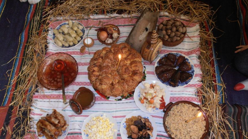 На трапезата трябва да има: варено жито, варен фасул, сарми, пълнени чушки с боб (или ориз), ошав, туршии, лук, чесън, мед и орехи, вино. В някои краища правят също тиквеник, зелник и малка пита, в която е скрита паричка (на когото се падне, ще бъде щастлив цялата година). В четирите ъгъла на стаята се поставя по един орех. Това се прави, за да се осветят четирите краища на света.