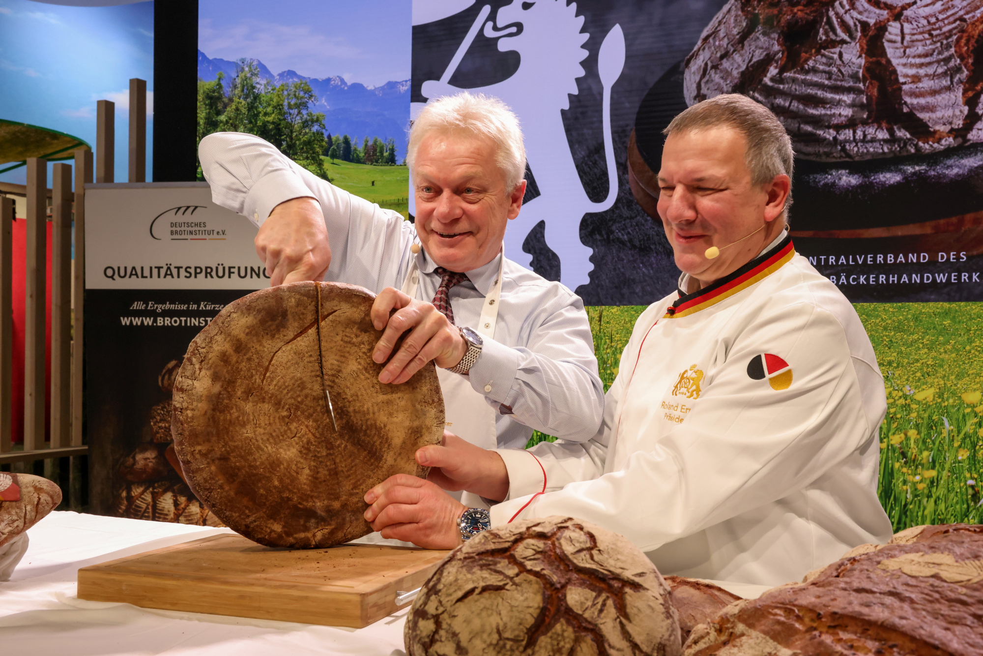 Разрязване на „Хляба на годината“ с федералния министър Алоис Райнер. В контекста на „Зелената седмица“ това е традиционен официален ритуал, с който се открива годината за хлебопроизводителите.